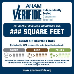 The AHAM Verifide® Mark provides a consistent industry standard — the Clean Air Delivery Rate (CADR) — that consumers can trust. This uniform information reduces confusion at the point of purchase, providing consumers with data that is comparable from product to product.